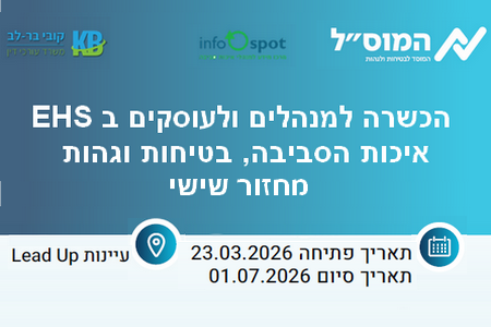 תעודה: יימי הקורס יעמדו במבחן גמר ויקבלו תעודת סיום מנהלי EHS מטעם המוסד לבטיחות ולגהות.