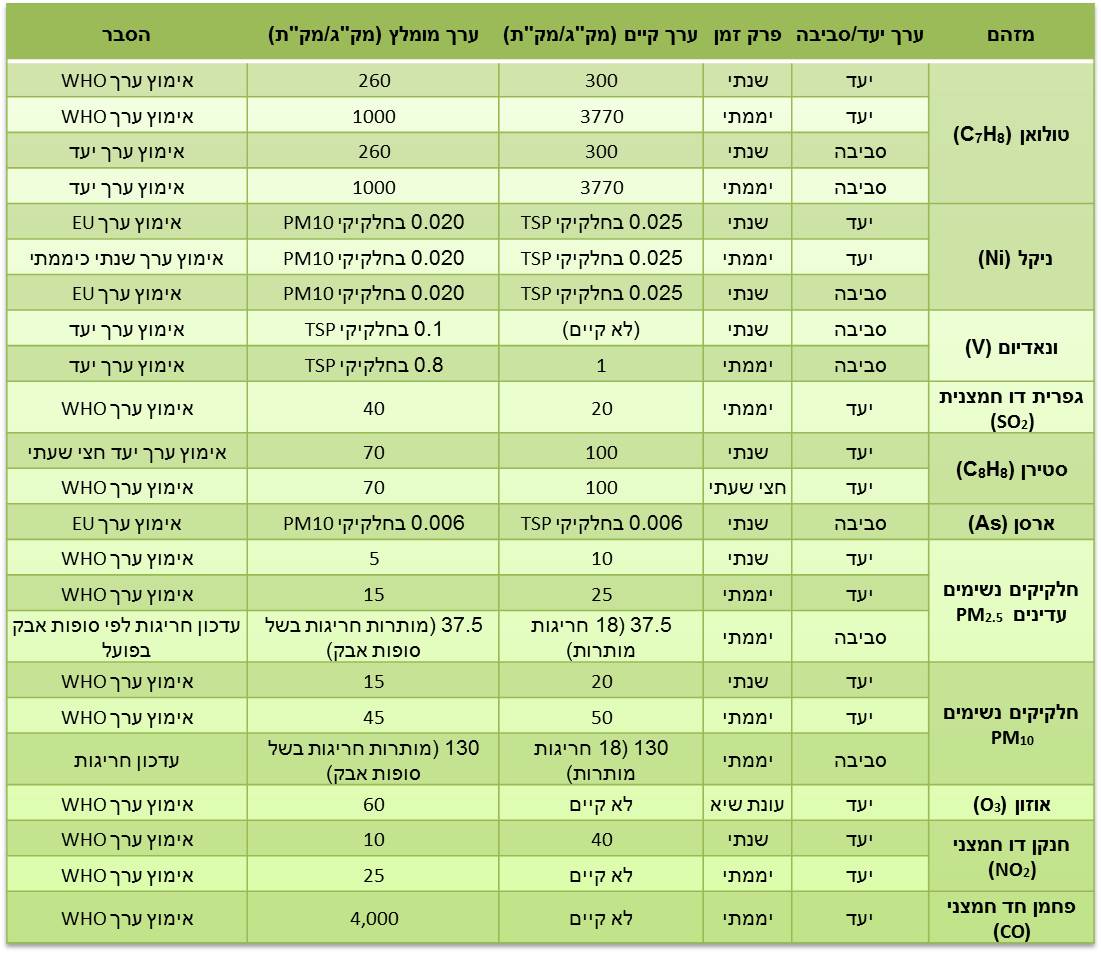 בנוסף לעדכון ערכי היעד לפי המלצות ארגון הבריאות העולמי, המשרד להגנ"ס הציע לעדכן ערכי איכות אוויר של 3 מזהמים נוספים, לפי עבודה שביצע ופרסם להערות הציבור לפני כחצי שנה. מדובר ב: טולואן, סטירן, ו-ניקל.