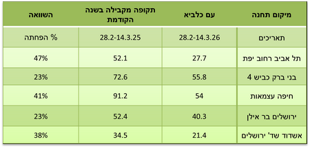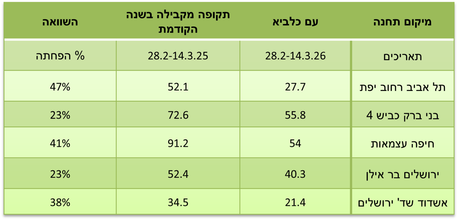 כדי לבדוק אם הייתה ירידה בזיהום האוויר בשבועיים הראשונים של המלחמה (14.3.2026–28.2), השוונו את ממוצע ריכוז תחמוצות החנקן (NOx) בתקופה זו לנתונים של התקופה המקבילה לפני שנה (14.3.2025–28.2) ב-5 תחנות ניטור אוויר תחבורתיות בערים מרכזיות בארץ: תל אביב – יפת, בני ברק כביש 4, חיפה – עצמאות, ירושלים – בר אילן, אשדוד – שדרות ירושלים.