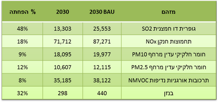 להלן יעדי התוכנית להפחתת פליטות המזהמים לאוויר לשנת 2030, ביחידות של טון פליטות לשנה.