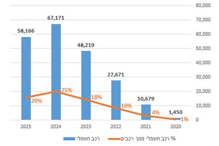 במקביל ירד גם חלקם של כלי הרכב החשמליים מסך מכירות כלי הרכב, מנתון שיא של כמעט 25% בשנת 2024 לכ-20% בשנת 2025.