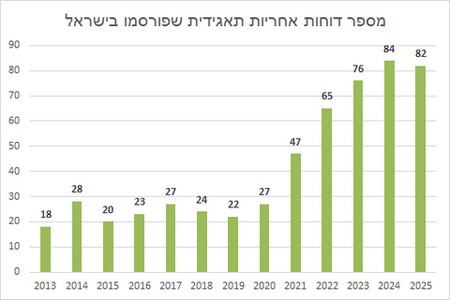 משנת 2021 ועד 2024 מספר החברות שפרסמו דוח אחריות תאגידית גדל באופן ניכר: מ-27 דוחות בלבד שפרסמו דוח בשנת 2020 ל-47 דוחות שפורסמו בשנת 2021, 65 דוחות בשנת 2022, 76 דוחות בשנת 2023 ונתון שיא של 84 דוחות בשנת 2024. כאמור, בשנת 2025 מספר הדוחות שפורסם דומה כאמור לזה בשנת 2024 ועומד על 82, נתון גבוה שמלמד על קפיצת המדרגה שתחום דוחות אחריות תאגידית עשה בישראל בשנים האחרונות.