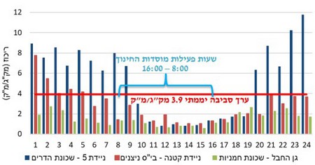 בתוך בית הספר נמדדו בשעות הלימודים (08:00–16:00) ריכוזים שעתיים מרביים שנעו בין 1 ל-2.84 מק"ג/מ"ק.