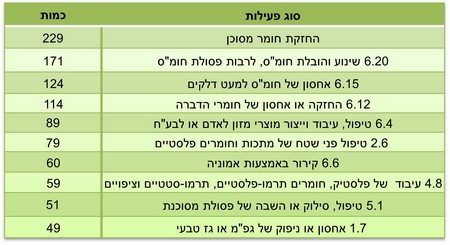 בחלוקה לפי תחומי פעילות, כ-524 עסקים, שהם שליש מהעסקים הנדרשים להיתר אחוד, מוגדרים כאלה בשל פעילות של החזקה או שינוע או אחסון של חומ"ס ופסולת חומ"ס.