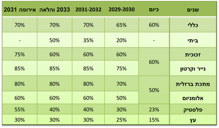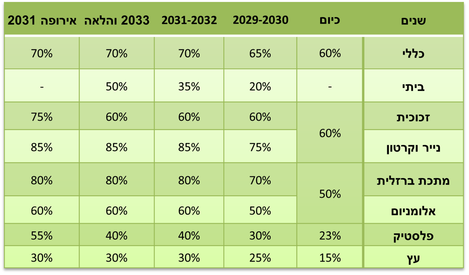 תזכיר החוק מציע להעלות בהדרגה את יעדי המיחזור של פסולת האריזות, בהתאם לאלה של האיחוד האירופי. כך יעד המיחזור הכללי יטפס מ-60% כיום ל-70% החל משנת 2031, ויעדי המיחזור לסוגי החומרים השונים יעלו גם הם לפי הטבלה הבאה.