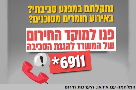 כבר ביום שבת נפתחו חדרי מצב ומוקדי חירום ייעודיים במשרדי הממשלה השונים, כולל במשרד להגנ"ס שהודיע כי מוקד החירום שלו תוגבר וכי בכל אירוע של חומרים מסוכנים או אירוע סביבתי אחר שעלול לסכן חיי אדם יש להתקשר למוקד שמספרו 6911*.